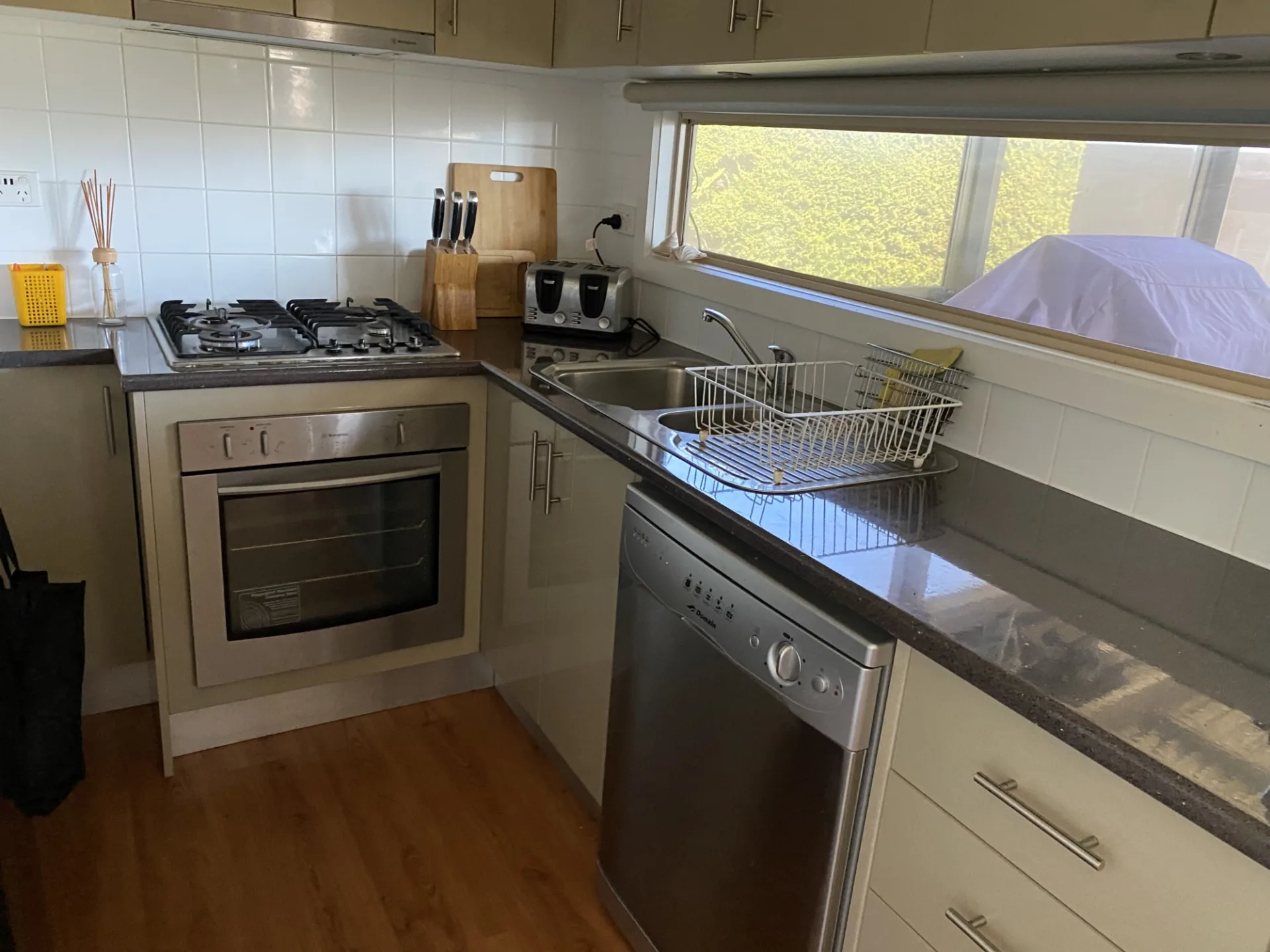 - Gas cooktop/oven, double sink, dishwasher + washing machine