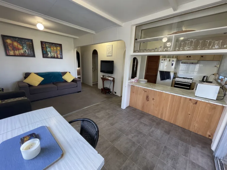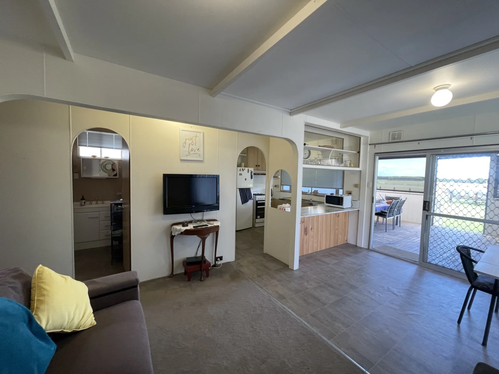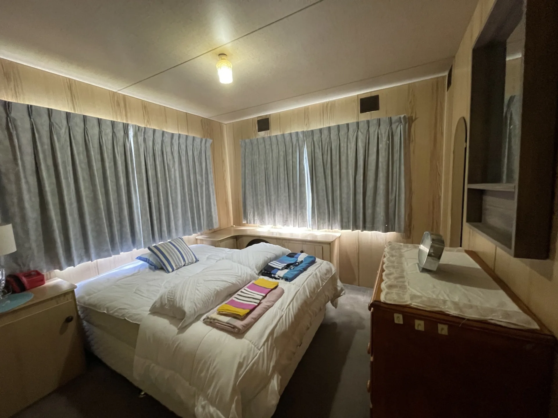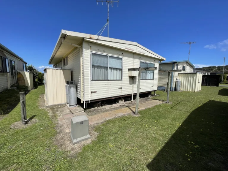 Sitting pretty on a large private site and overlooking a spread of open green space, this 2-bedroom cabin is the kind of find people circle the park hoping to spot. The layout is generous, welcoming, and designed for easy holiday living — combined lounge and dining, separate toilet, full laundry, and a deck that just begs for long afternoons. It’s older-style, sure, but kept in genuinely great condition — the kind that stands the test of time.