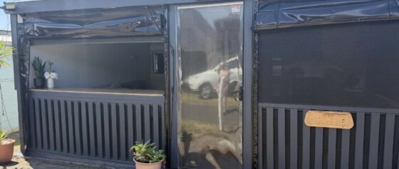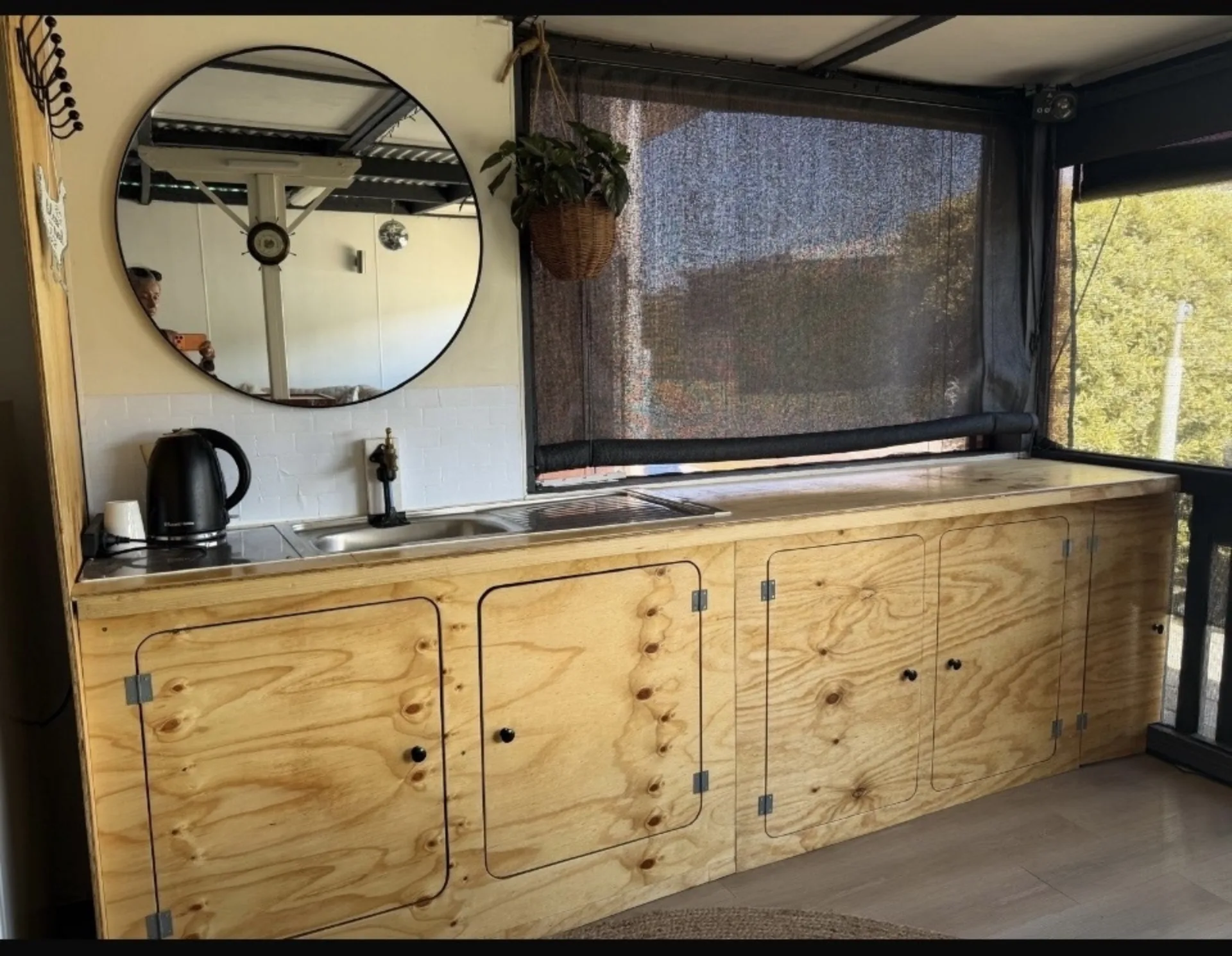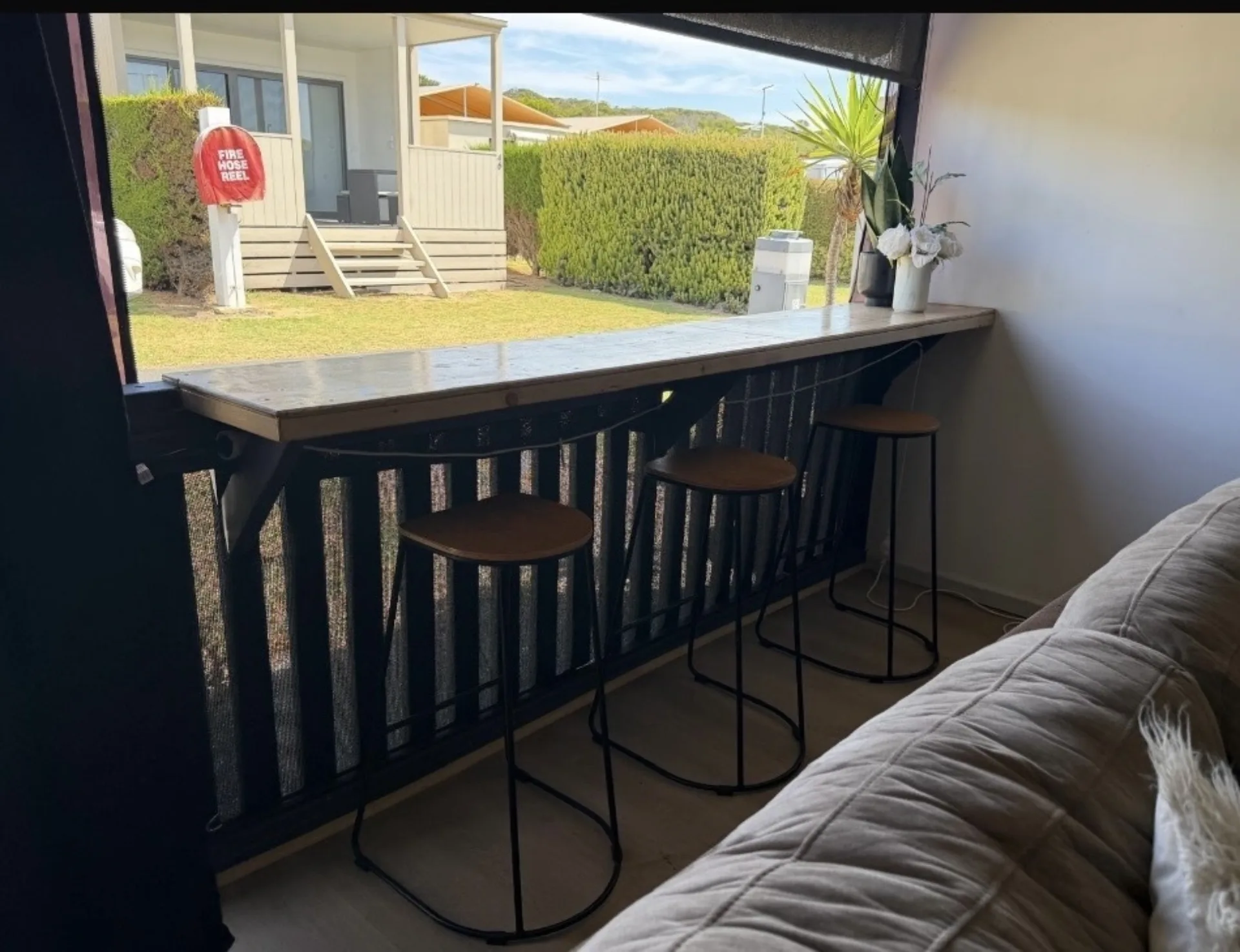 • Enclosed verandah with seating area, kitchenette + bar with stools