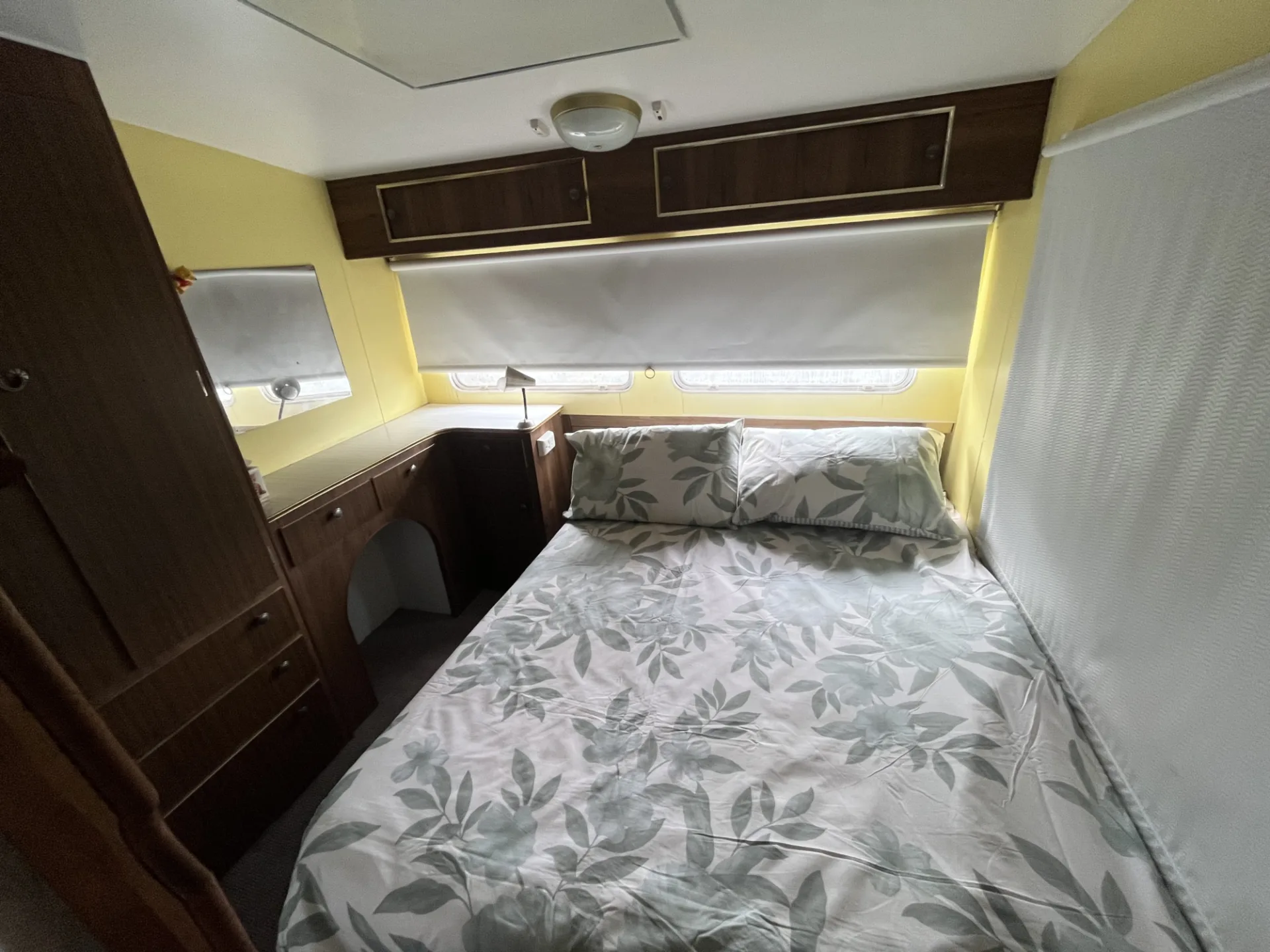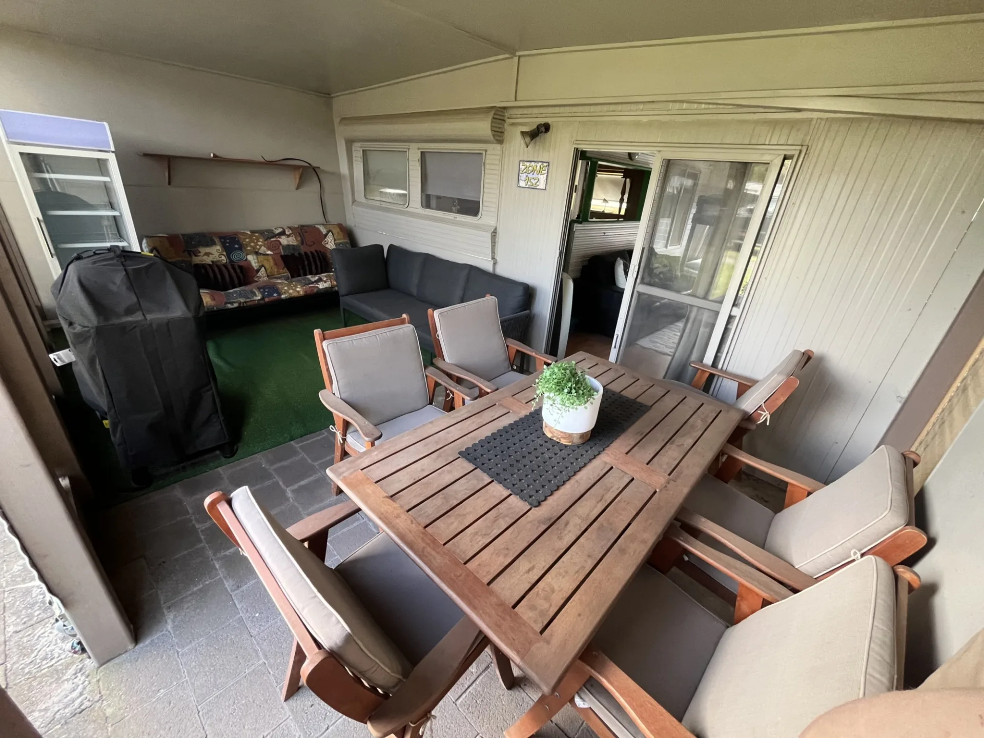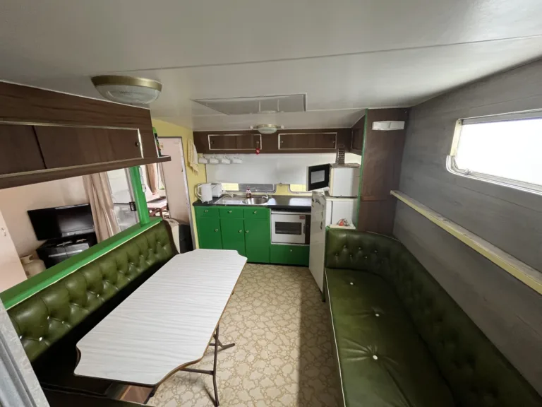 Inside, you’ll find a 1-bedroom layout with a separate bunk area, sleeping up to six. An internal kitchenette and cosy living space make it easy to settle in, while the large enclosed verandah adds plenty of extra room to relax or entertain, rain or shine.