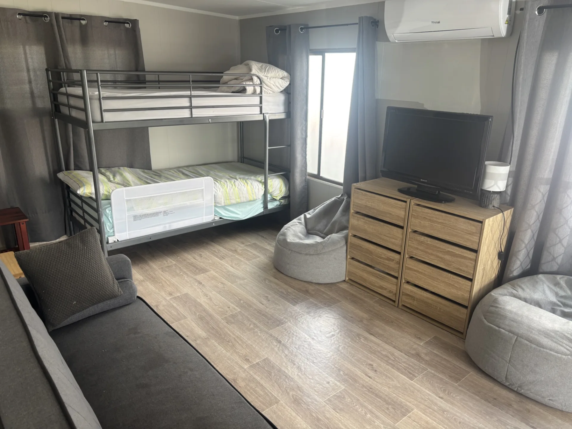 • Sleeps 8 — queen bed; bunks + double futon in annex