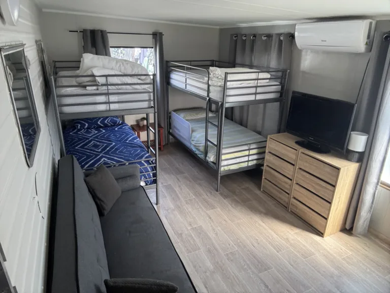 • Sleeps 8 — queen in caravan; bunks + double futon in annex