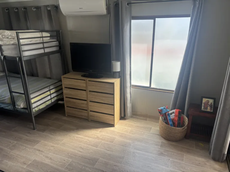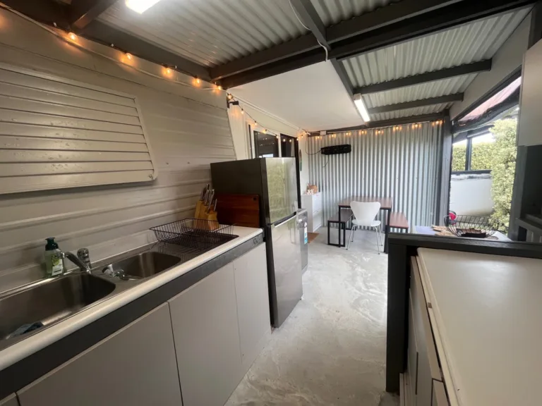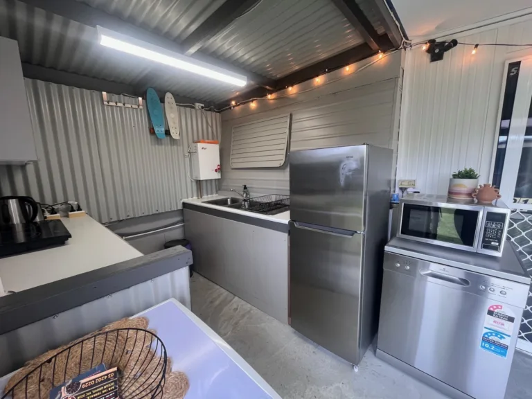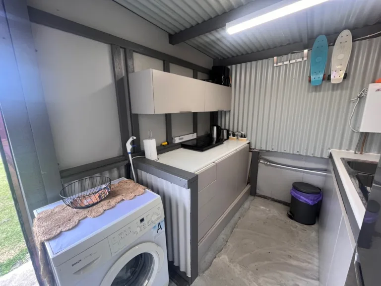 The kitchenette is fully equipped—washing machine, electric cooktop, air-fryer, fridges—for effortless stays.