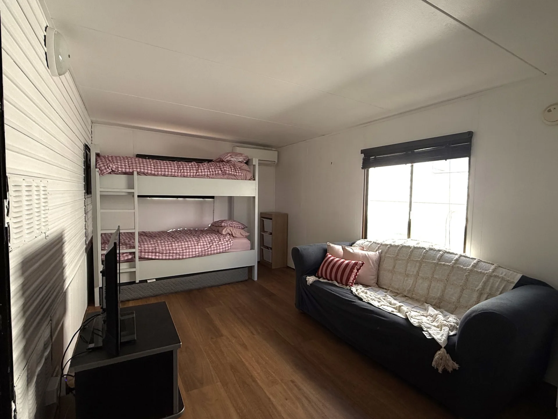 • 2 sleeping areas – queen bed + bunks
